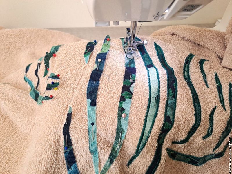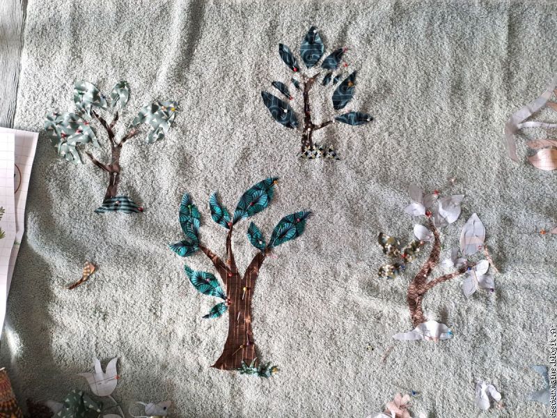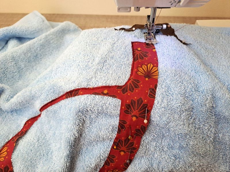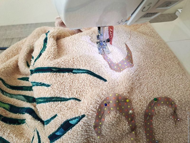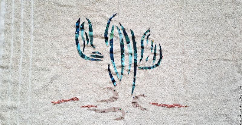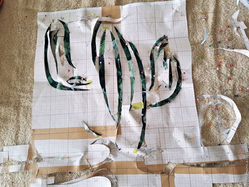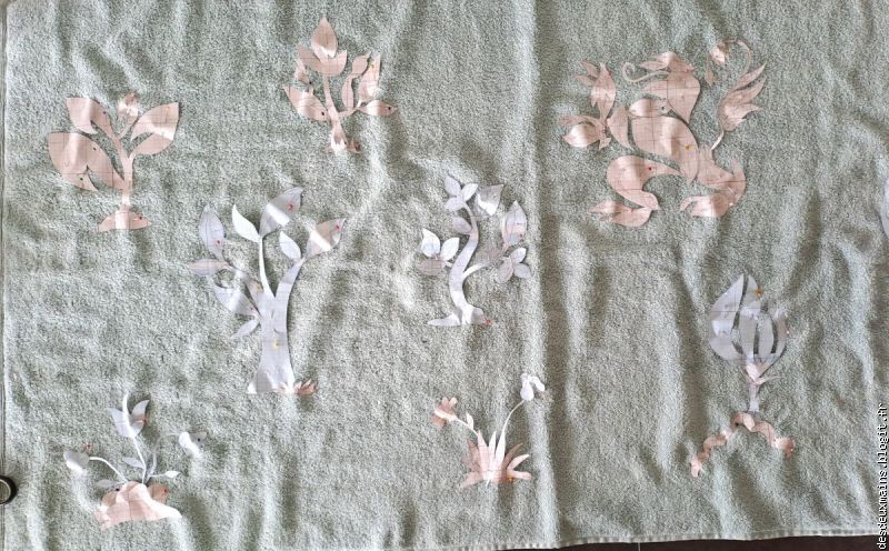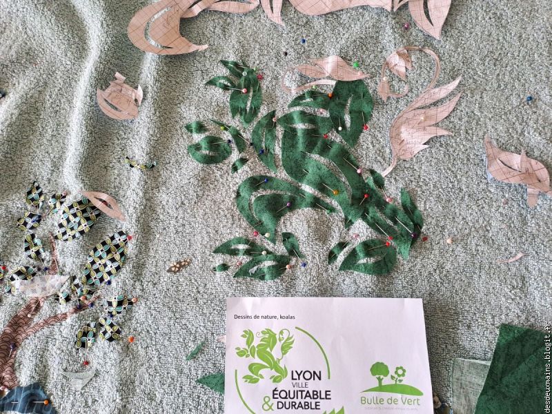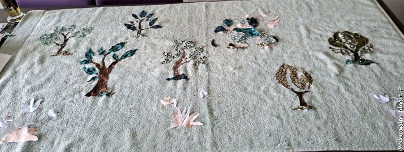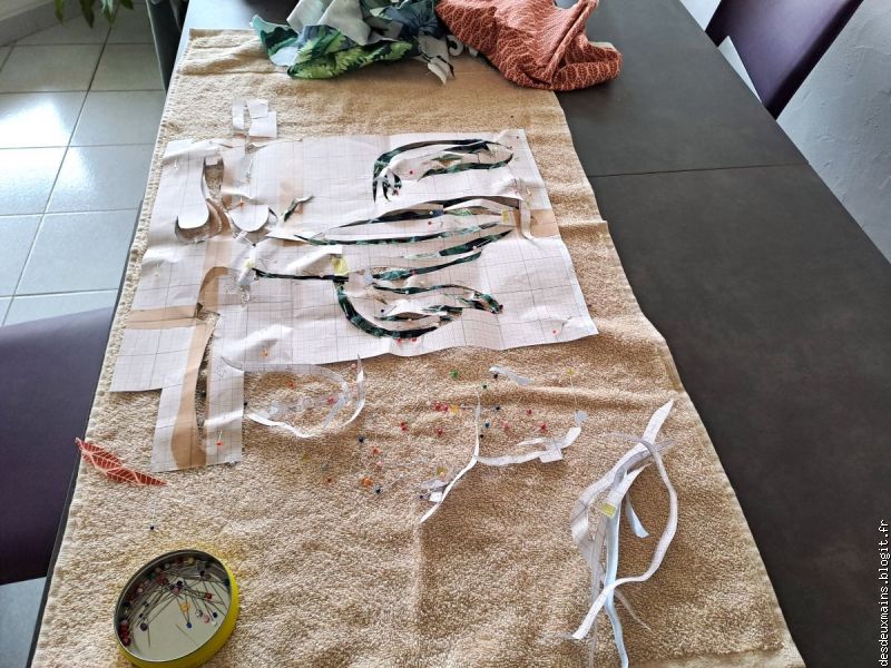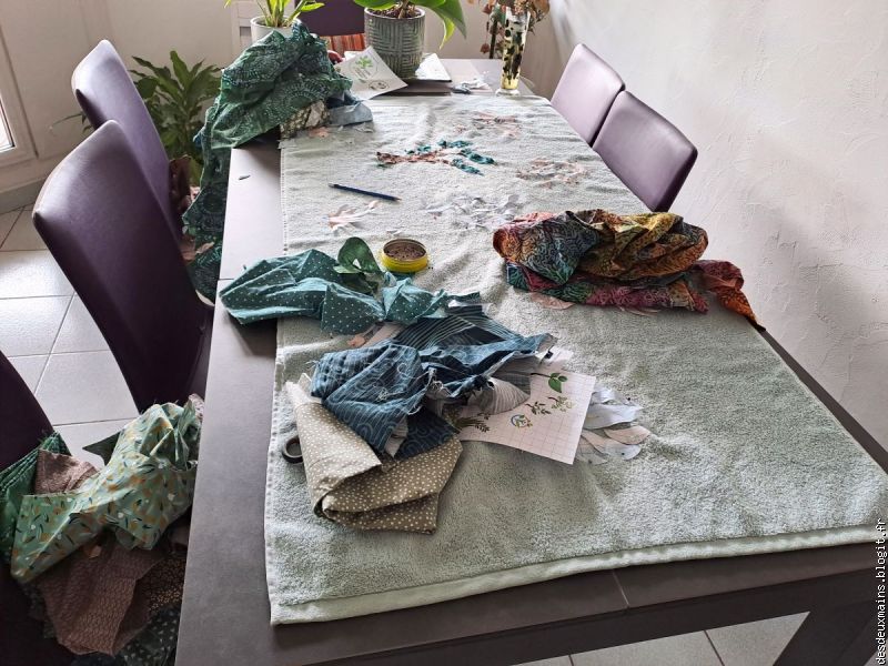 Facile à réaliser de par l'extrême épuration des lignes et des courbes du dit-dessin, suivi logiquement du choix des tissus (dont un "tout en un" **), la plus grande difficulté a résidé dans le fait de trouver un endroit pour s'installer afin de tout mettre en place, agencer et coudre, sans . . . éveiller de soupçon ..... alentour !!