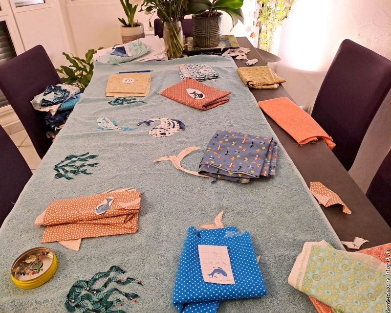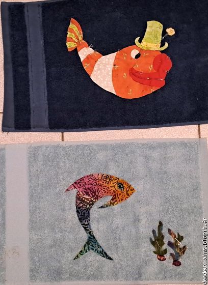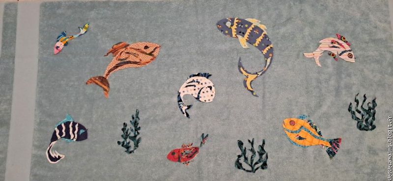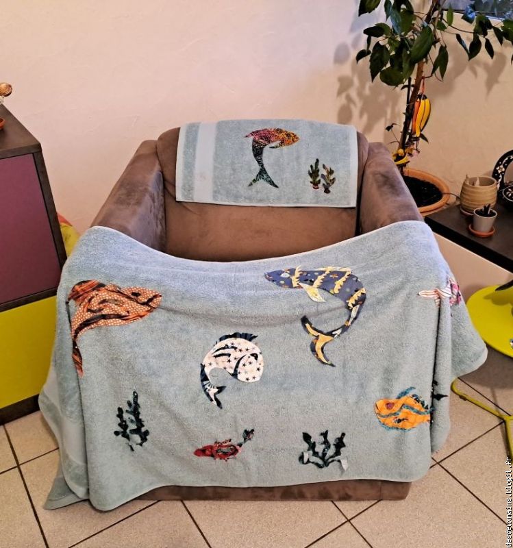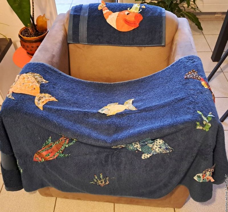 La première version correspondait à l'intention de créer le " P " de Patricia à travers les deux poissons inversement incurvés du centre bas de la serviette, mais, même en variant les tissus et leurs couleurs ou le positionnement des dits-poissons, le résultat ne m'enchantait pas plus que ça.