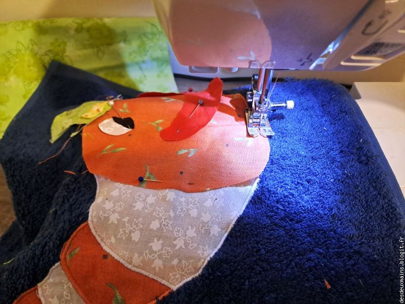 de la serviette qui permet de piquer en proportion sur une portion (oui, c'est exprès ...) de surface réduite * et donc exigeante, alors que toutes les autres parties sont retenues par des épingles pour éviter les . . . encombrements à la . . . lyonnaise !!!